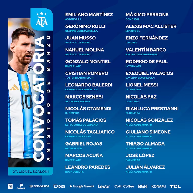 La convocatoria no solo premia la actualidad de Palacios, sino que también reafirma la confianza del cuerpo técnico en jóvenes que buscan ganarse un lugar definitivo de cara a la próxima Copa del Mundo. En ese grupo aparecen apellidos como Valentín Barco (Racing de Estrasburgo), Máximo Perrone (Como de Italia), Gianluca Prestianni (Benfica) y el goleador José «Flaco» López (Palmeiras).