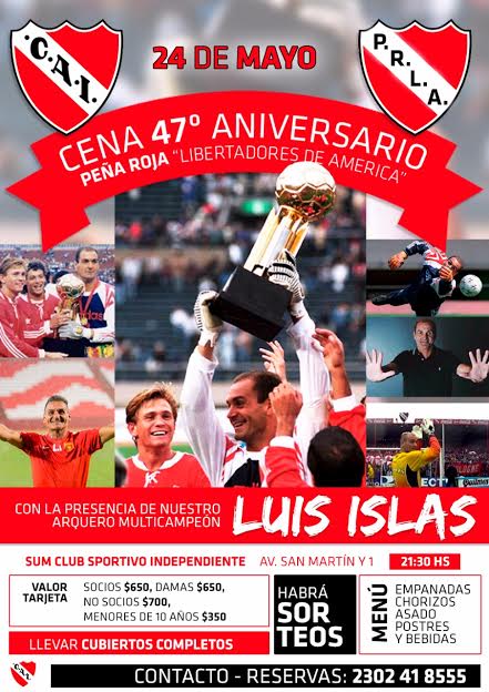 El exarquero de Independiente de Avellaneda y de la Selección Argentina, Luis Islas, llegará a General Pico para formar parte del festejo por el 47 aniversario de la Peña Roja Libertadores de América. La celebración será el viernes 24 de mayo, en el SUM de Sportivo Independiente, con una cena.