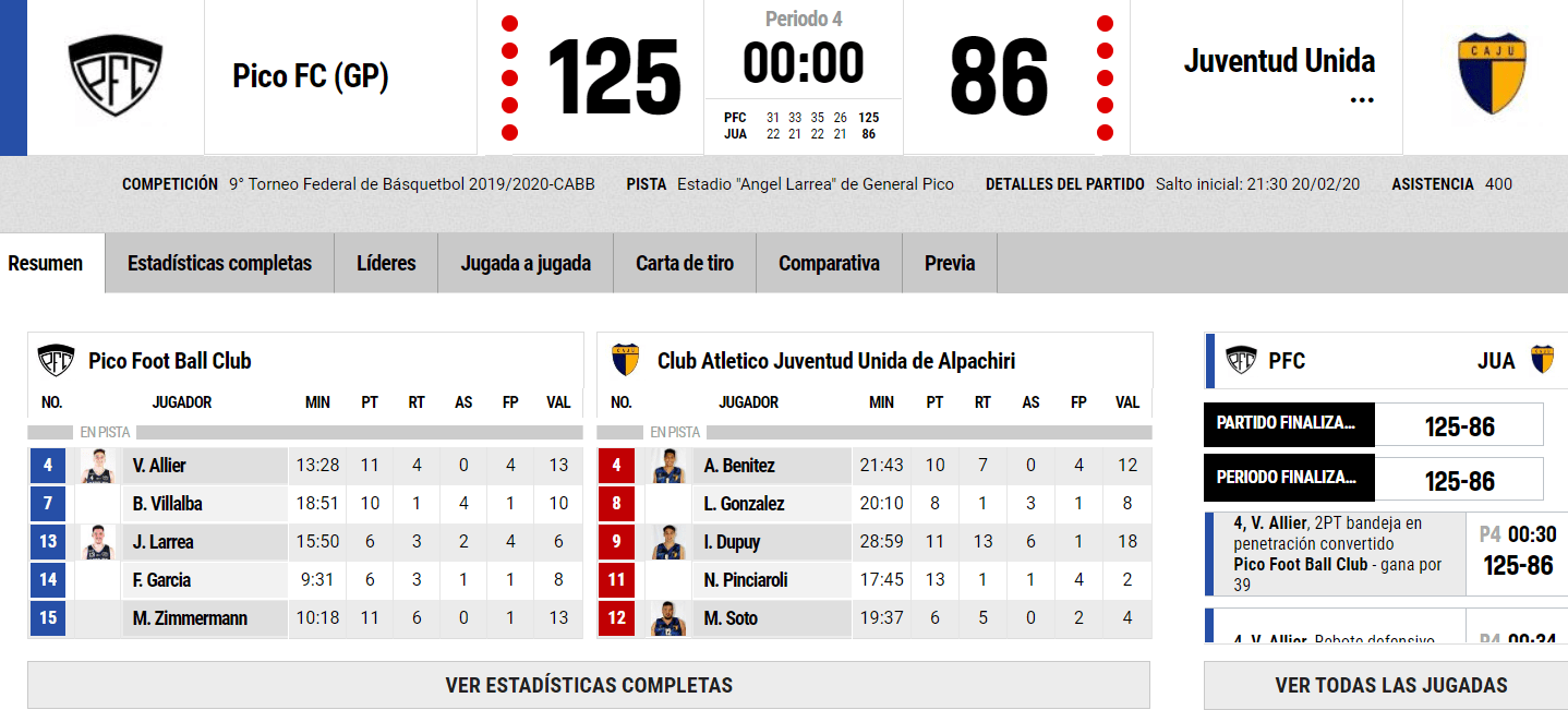 Esta noche, en un gran encuentro, Pico Football Club derrotó a Juventud Unida de Alpachiri por 125 a 86.